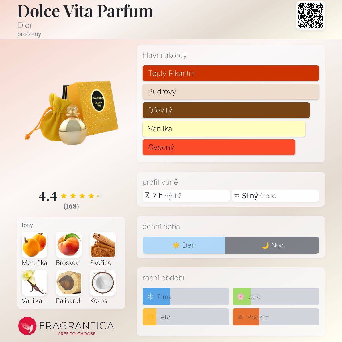 Dolce Vita Parfum podle Dior je Floral vůně pro ženy. Dolce Vita Parfum byl/a uveden/a v roce 1994. Dolce Vita Parfum byl/a vytvořen/a Pierre Bourdon a Maurice Roger. Vrchní tóny jsou Broskev, Kardamom, Lilie, Bergamot, Růže a Grapefruit; střední tóny jsouMeruňka, Skořice, Palisandr, Otočník, Lilie a Magnólie ; základní tóny jsou Vanilka, Kokos, Santalové dřevo a Cedr.