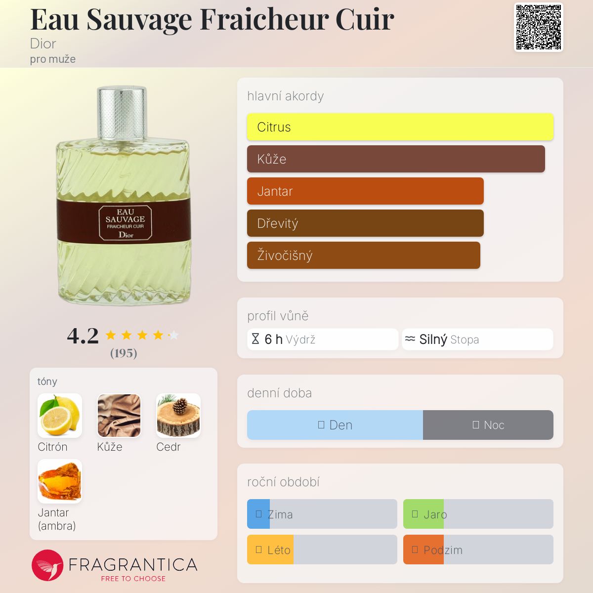 Eau Sauvage Fraicheur Cuir podle Dior je Citrus Aromatic vůně pro muže. Eau Sauvage Fraicheur Cuir byl/a uveden/a v roce 2007. "Nosem" za touto vůní je François Demachy. Vrchní tón je Citron amalfi ; střední tón jeVirginský cedr ; základní tóny jsou Kůže a Jantar (ambra).