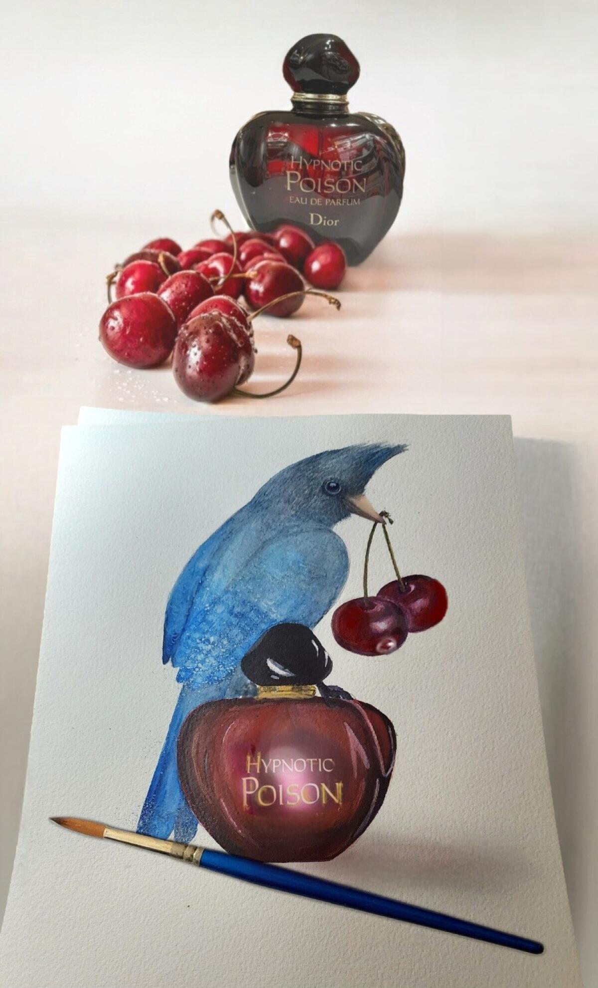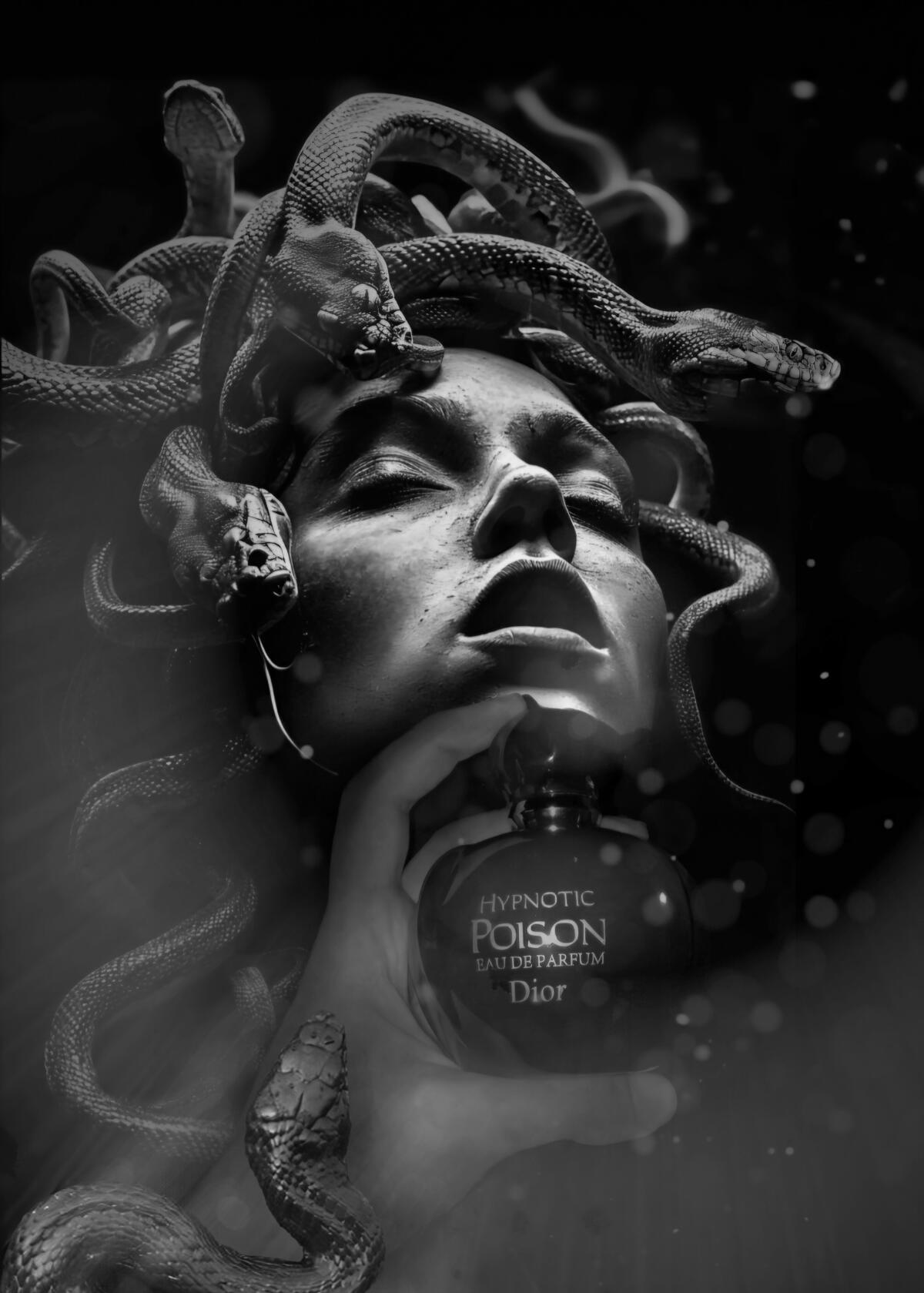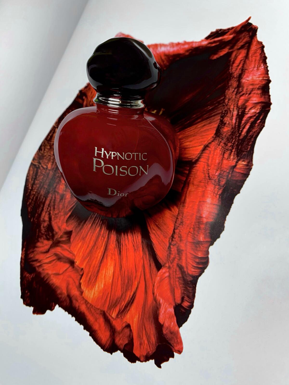 Krásná a zajímavá Milla Jovovich s červeným flakonem parfému ve tvaru srdce na hřbetu ruky. Vypadalo to jako malé pulzující srdíčko vytržené čarodějnicí s drápovitými nehty. ...A jaká vůně z toho srdce vycházela... Kouzlo Lásky, dojemná věc. Nemám slov, abych popsala, čím pro mě Hypnotický jed byl, od prvního okamžiku, kdy jsem ho spatřila a mé smysly ho vnímaly. Byla tuhá zima ve škole, moje třída se choulila kolem topení, aby nám bylo teplo ve třídě s vlhkými inkrustacemi na stěnách. Moje spolužačka ze třetího ročníku střední školy Marilena, ta, která měla nos na lanýže a která byla na výletě pro parfém "Indecent" Alberta Tomby, jímž se koupal můj italský učitel po třicítce, ke mně přistoupila a nadšeně řekla: "Musím ti dát pocítit něco nového!" a přitom mi ukazovala vzorek nové vůně od Diora.