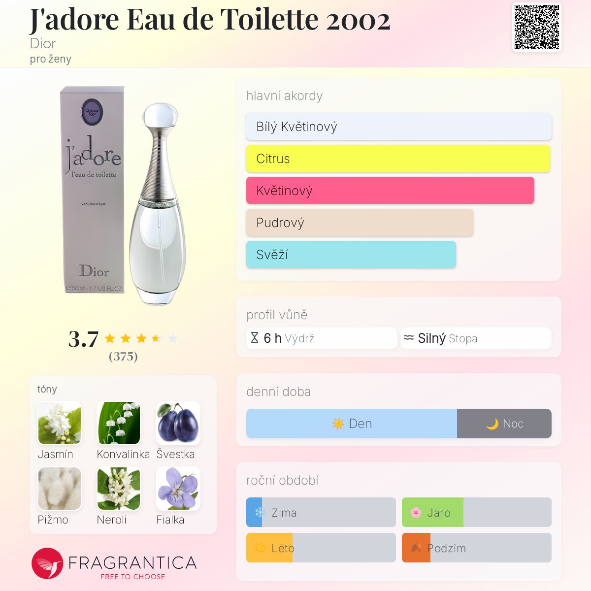 J'adore Eau de Toilette 2002 podle Dior je Floral Fruity vůně pro ženy. J'adore Eau de Toilette 2002 byl/a uveden/a v roce 2002. Vrchní tóny jsou Švestka, Neroli, Mandarinka, Bergamot, Citrón a Muškátový oříšek; střední tóny jsouJasmín, Konvalinka, Fialka, Orchidej, Růže a Magnólie ; základní tóny jsou Švestka, Pižmo a Vanilka.