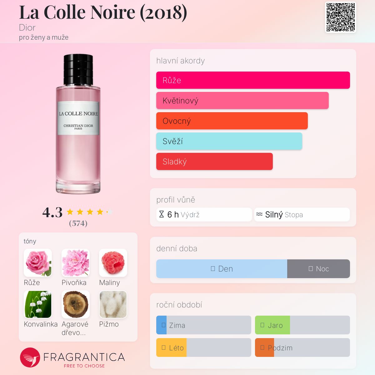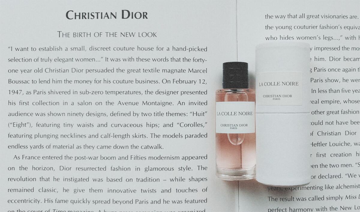 La Colle Noire (2018) podle Dior je Orientální Floral vůně pro ženy a muže. La Colle Noire (2018) byl/a uveden/a v roce 2018. "Nosem" za touto vůní je François Demachy. Vrchní tóny jsou Černý rybíz a Citrón; střední tóny jsouRůže, Pivoňka, Maliny, Konvalinka a Broskev ; základní tóny jsou Agarové dřevo (oud), Bílé pižmo, Med, Santalové dřevo a Jantarové dřevo.