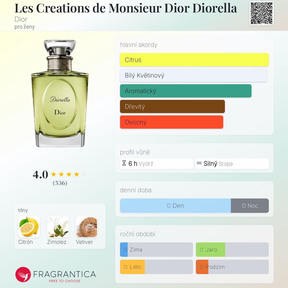 Les Creations de Monsieur Dior Diorella podle Dior je Chypre Floral vůně pro ženy. Les Creations de Monsieur Dior Diorella byl/a uveden/a v roce 2009. Vrchní tón je Citron amalfi ; střední tón jeZimolez ; základní tón je Vetiver.
