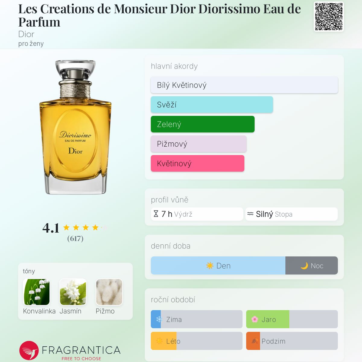 Les Creations de Monsieur Dior Diorissimo Eau de Parfum podle Dior je Floral vůně pro ženy. Les Creations de Monsieur Dior Diorissimo Eau de Parfum byl/a uveden/a v roce 2009. "Nosem" za touto vůní je François Demachy. Vrchní tón je Konvalinka ; střední tón jeJasmín ; základní tón je Pižmo.