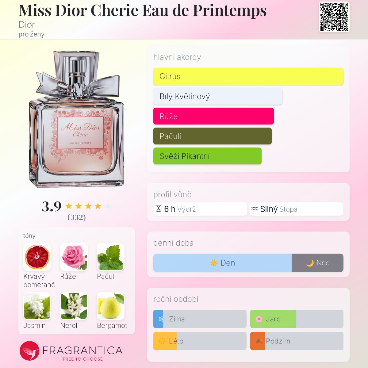 Miss Dior Cherie Eau de Printemps podle Dior je Chypre Floral vůně pro ženy. Miss Dior Cherie Eau de Printemps byl/a uveden/a v roce 2008. "Nosem" za touto vůní je François Demachy. Vrchní tóny jsou Krvavý pomeranč a Bergamot; střední tóny jsouRůže, Jasmín a Neroli ; základní tón je Pačuli.