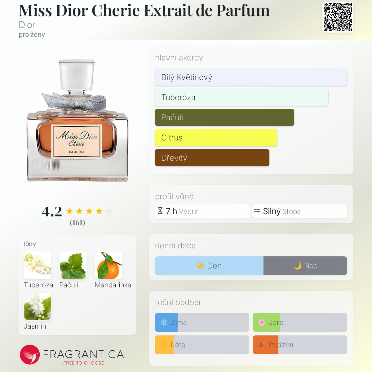 Miss Dior Cherie Extrait de Parfum podle Dior je Chypre Floral vůně pro ženy. Miss Dior Cherie Extrait de Parfum byl/a uveden/a v roce 2005. "Nosem" za touto vůní je Christine Nagel. Vrchní tón je Mandarinka ; střední tóny jsouTuberóza a Jasmín ; základní tón je Pačuli.