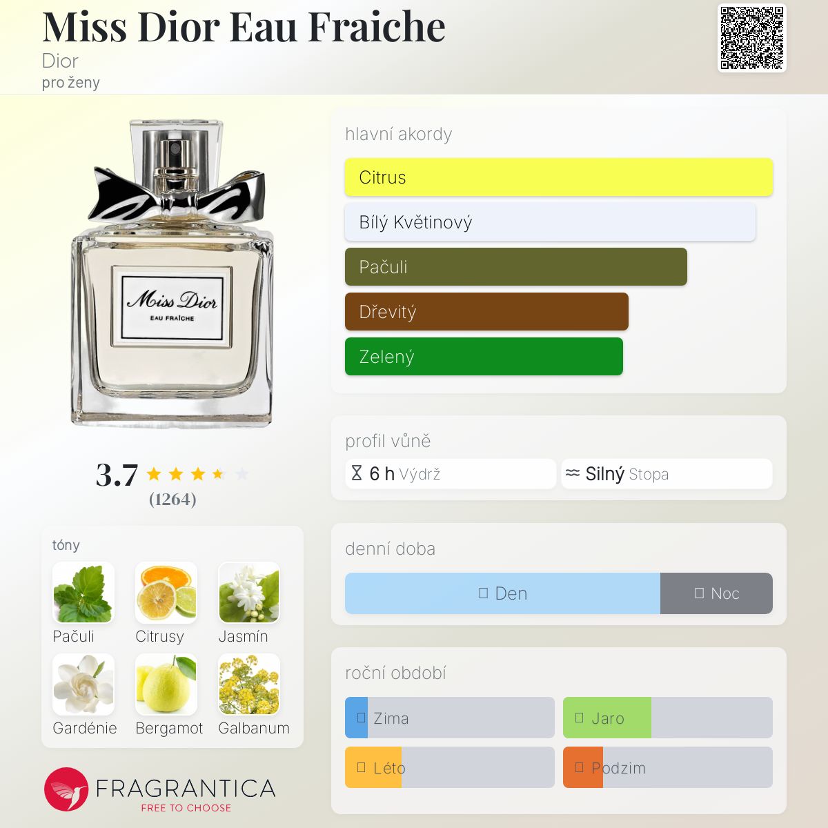 Miss Dior Eau Fraiche podle Dior je Chypre Floral vůně pro ženy. Miss Dior Eau Fraiche byl/a uveden/a v roce 2012. "Nosem" za touto vůní je François Demachy. Vrchní tóny jsou Citrusy, Bergamot a Galbanum; střední tóny jsouJasmín a Gardénie ; základní tón je Pačuli.