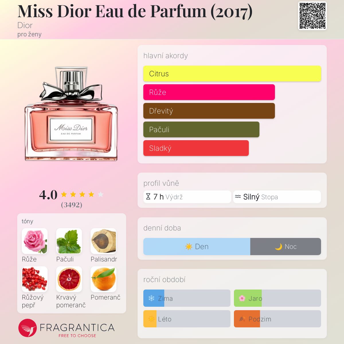 Miss Dior Eau de Parfum (2017) podle Dior je Chypre Floral vůně pro ženy. Miss Dior Eau de Parfum (2017) byl/a uveden/a v roce 2017. "Nosem" za touto vůní je François Demachy. Vrchní tóny jsou Růžový pepř, Krvavý pomeranč, Sladký pomeranč, Mandarinka, Kalábrijský bergamot a Citrón; střední tóny jsouTravní růže, Damašská růže a Jasmínový list ; základní tóny jsou Pačuli a Palisandr.