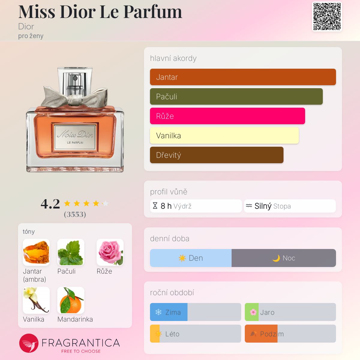 Miss Dior Le Parfum podle Dior je Chypre Floral vůně pro ženy. Miss Dior Le Parfum byl/a uveden/a v roce 2012. "Nosem" za touto vůní je François Demachy. Vrchní tón je Mandarinka ; střední tóny jsouTurecká růže a Bulharská růže ; základní tóny jsou Jantar (ambra), Pačuli a Vanilka.