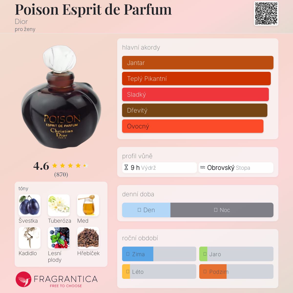 Poison Esprit de Parfum podle Dior je Floral vůně pro ženy. Poison Esprit de Parfum byla spuštěna během 1990. "Nosem" za touto vůní je Edouard Flechier. Vrchní tóny jsou Švestka, Lesní plody, Anýz, Palisandr, Koriandr a Pepř; střední tóny jsouTuberóza, Med, Kadidlo, Hřebíček, Skořice, Opoponax, Růže, Jasmín a Pomerančový květ ; základní tóny jsou Jantar (ambra), Vanilka, Pižmo, Santalové dřevo, Otočník, Vetiver a Cedr.