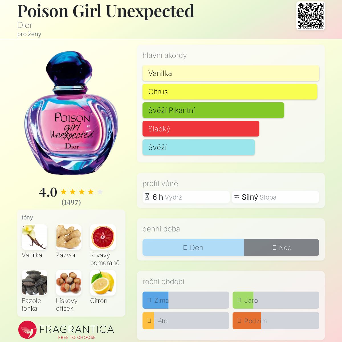 Poison Girl Unexpected podle Dior je Orientální Vanilla vůně pro ženy. Poison Girl Unexpected byl/a uveden/a v roce 2018. "Nosem" za touto vůní je François Demachy. Vrchní tóny jsou Zázvor, Krvavý pomeranč a Citrón; střední tón jeDamašská růže ; základní tóny jsou Vanilka, Fazole tonka, Lískový oříšek a Kašmír.