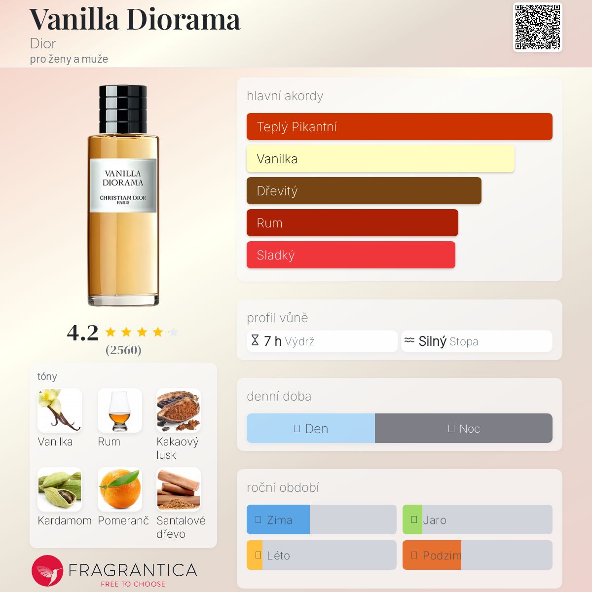 Vanilla Diorama podle Dior je Orientální Vanilla vůně pro ženy a muže. Vanilla Diorama byl/a uveden/a v roce 2021. "Nosem" za touto vůní je François Demachy. Vrchní tóny jsou Pomeranč, Růžový pepř a Citrón; střední tóny jsouRum, Kakao a Kardamom ; základní tóny jsou Bourbonská vanilka, Santalové dřevo a Pačuli.
