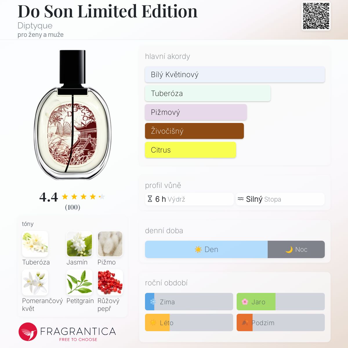 Do Son Limited Edition podle Diptyque je Floral vůně pro ženy a muže. Toto je nová vůně. Do Son Limited Edition byl/a uveden/a v roce 2024. "Nosem" za touto vůní je Fabrice Pellegrin. Vrchní tóny jsou Pomerančový květ, Pomerančový list a Růžový pepř; střední tóny jsouTuberóza a Jasmín ; základní tóny jsou Pižmo, Benzoin a Růže.