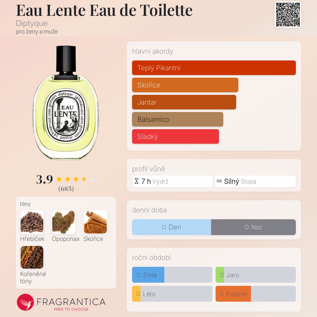 Eau Lente Eau de Toilette podle Diptyque je Orientální vůně pro ženy a muže. Eau Lente Eau de Toilette byl/a uveden/a v roce 1986. Eau Lente Eau de Toilette byl/a vytvořen/a Desmond Knox-Leet a Serge Kalouguine. Vrchní tóny jsou Hřebíček a Skořice; střední tón jeKoření ; základní tón je Opoponax.