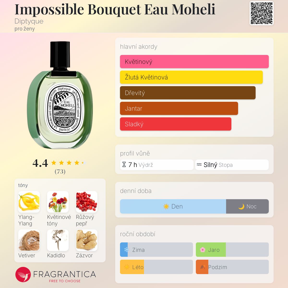 Impossible Bouquet Eau Moheli podle Diptyque je Floral Woody Musk vůně pro ženy. Impossible Bouquet Eau Moheli byl/a uveden/a v roce 2020. Vrchní tóny jsou Růžový pepř a Zázvor; střední tóny jsouYlang-Ylang, Květinové tóny a Kadidlo ; základní tóny jsou Vetiver, Benzoin a Pačuli.
