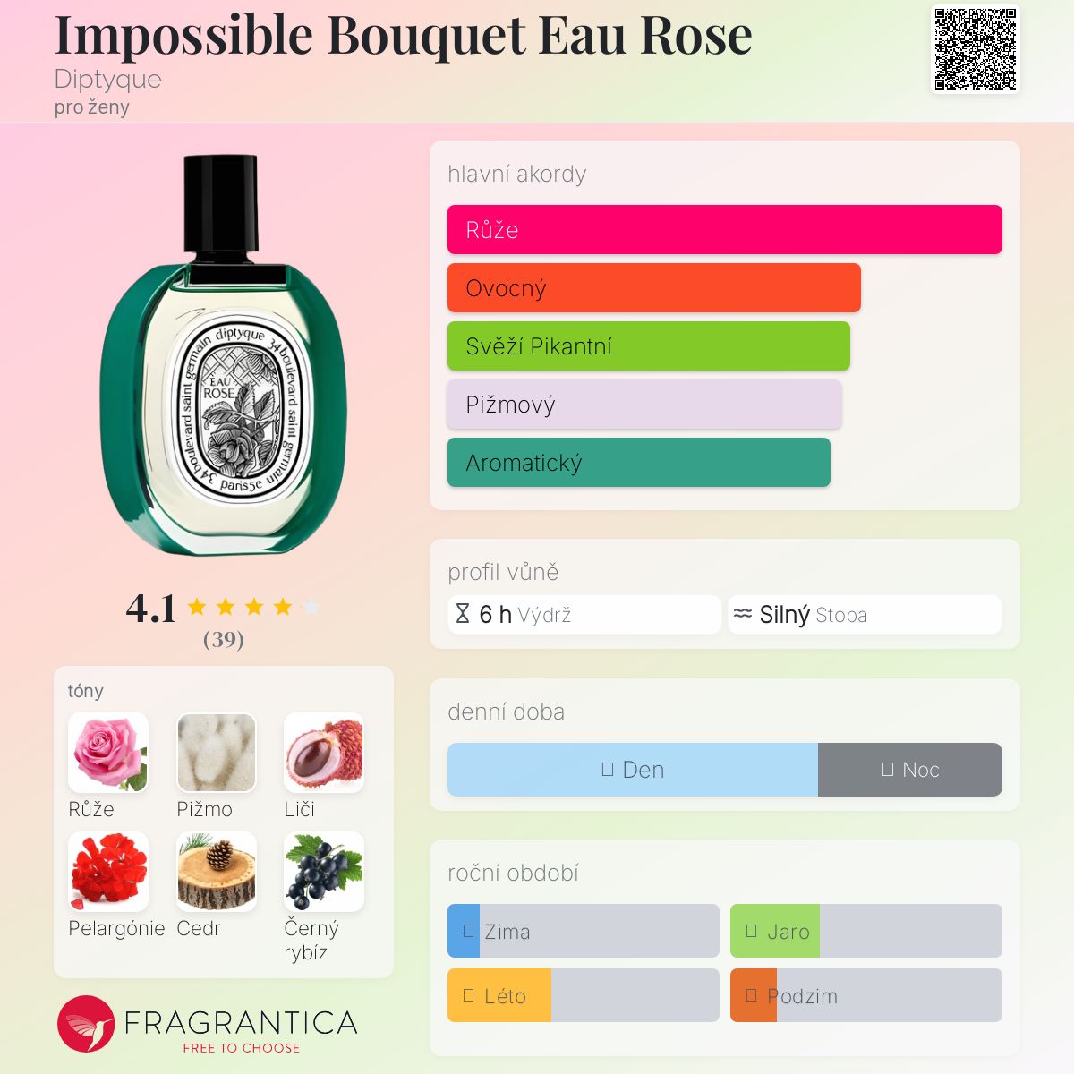 Impossible Bouquet Eau Rose podle Diptyque je Floral Fruity vůně pro ženy. Impossible Bouquet Eau Rose byl/a uveden/a v roce 2020. Vrchní tóny jsou Liči, Černý rybíz a Bergamot; střední tóny jsouRůže, Pelargónie a Jasmín ; základní tóny jsou Pižmo, Virginský cedr a Med.