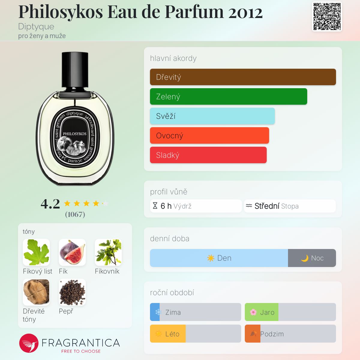 Philosykos Eau de Parfum 2012 podle Diptyque je Aromatic Green vůně pro ženy a muže. Philosykos Eau de Parfum 2012 byl/a uveden/a v roce 2012. "Nosem" za touto vůní je Olivia Giacobetti. Vrchní tóny jsou Fíkový list a Fík; střední tón jeFíkovník ; základní tóny jsou Dřevité tóny a Černý pepř.
