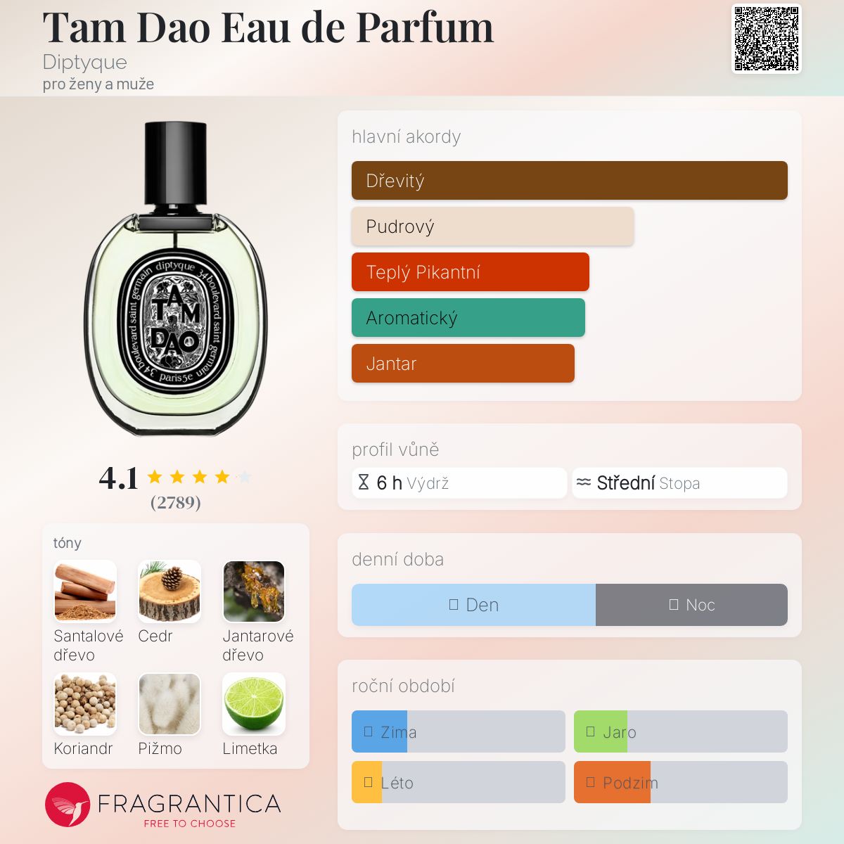 Tam dao je kořeněné, téměř pepřové santalové dřevo. Především je však dřevitá. Je v ní hodně cedrového dřeva, které spolu s koriandrem vytváří akord podobný cypřiši, který mi připomíná Bois Marocain. V pyramidě verze EDP cypřiš není přítomen, ale vnímám ho.