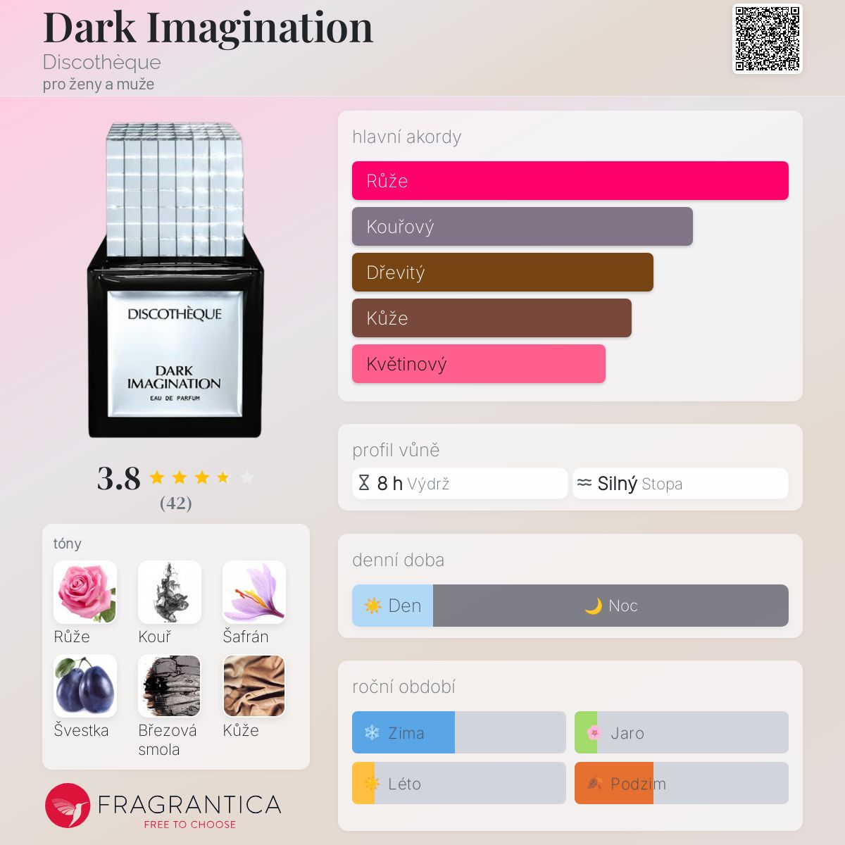 Dark Imagination podle Discothèque je Orientální Floral vůně pro ženy a muže. Toto je nová vůně. Dark Imagination byl/a uveden/a v roce 2024. "Nosem" za touto vůní je Elodie Durande. Vrchní tóny jsou Damašská růže, Šafrán a Švestka; střední tóny jsouMarocká růže, Březová smola a Kůže ; základní tóny jsou Kouř, Pačuli, Cedr, Vetiver a Jantar (ambra).