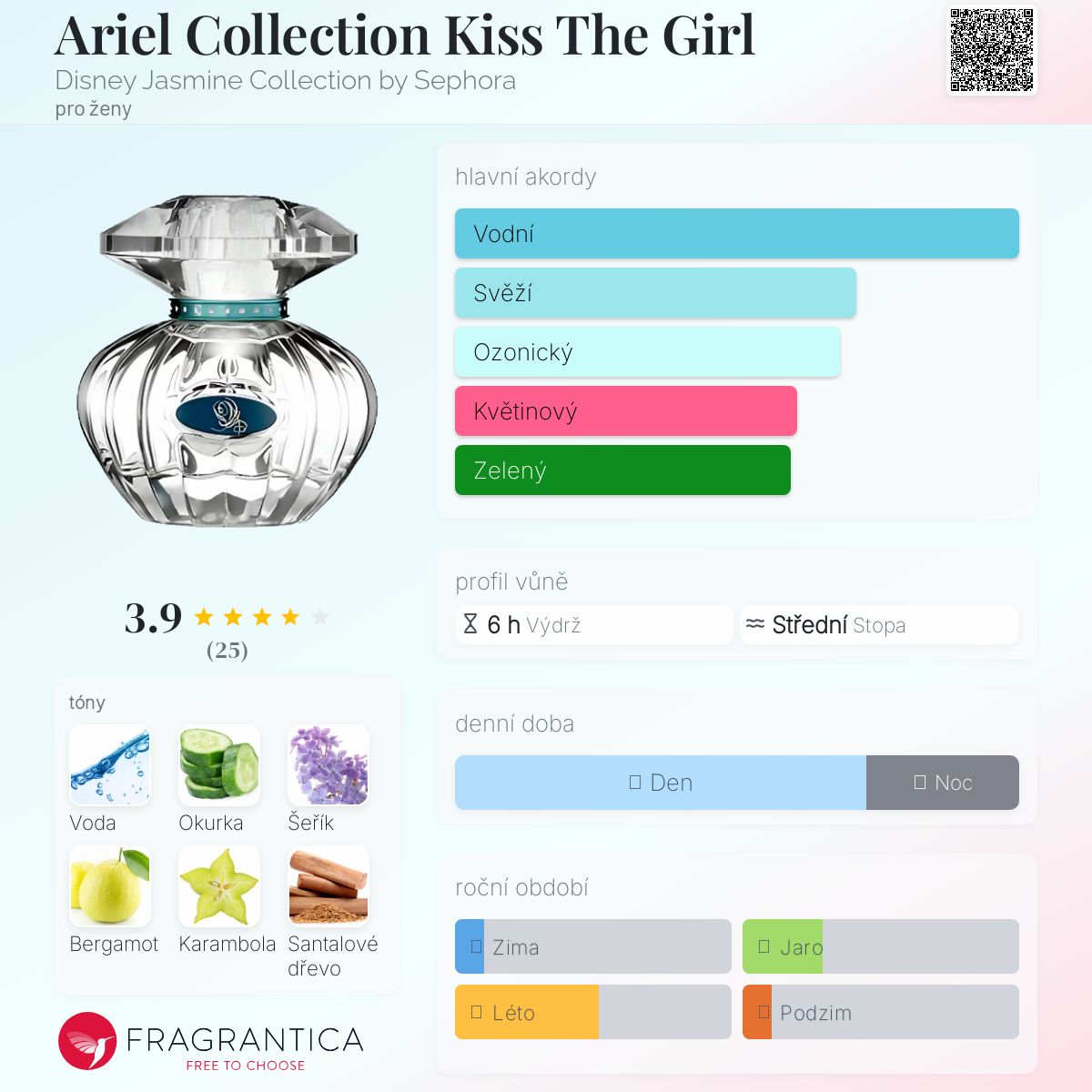 Ariel Collection Kiss The Girl podle Disney Jasmine Collection by Sephora je Floral Aquatic vůně pro ženy. Ariel Collection Kiss The Girl byl/a uveden/a v roce 2013. Vrchní tóny jsou Vodnaté tóny, Okurka a Bergamot; střední tóny jsouŠeřík a Karambola ; základní tóny jsou Santalové dřevo, Bílé pižmo a Ambra.