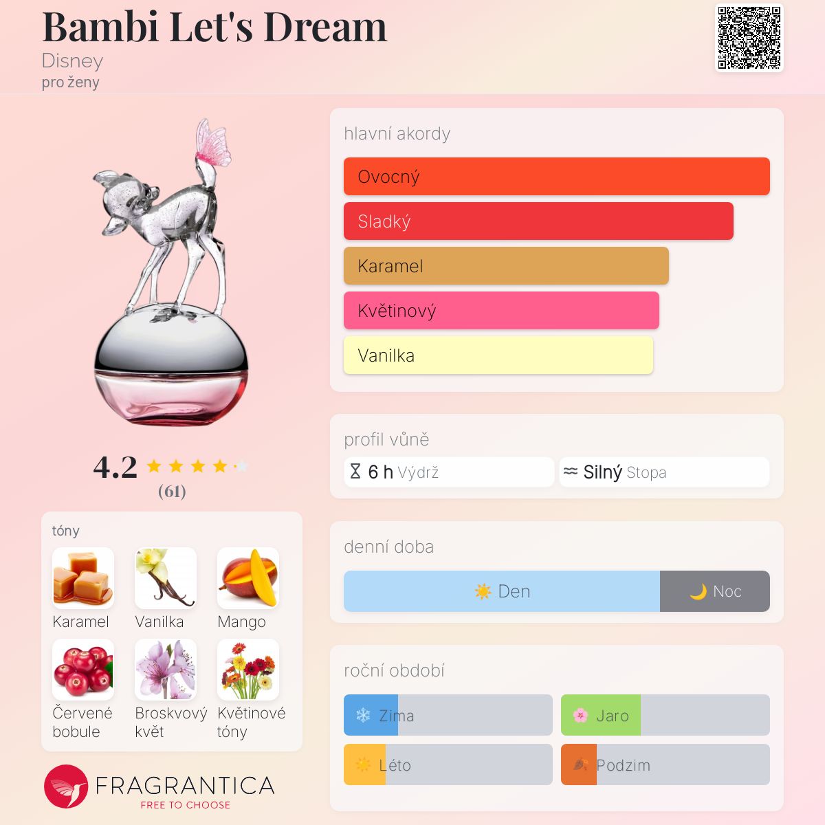 Bambi Let's Dream podle Disney je Floral Fruity Gourmand vůně pro ženy. Bambi Let's Dream byl/a uveden/a v roce 2012. Vrchní tóny jsou Mango, Červené bobule a Brusinky; střední tóny jsouKaramel, Broskvový květ a Květinové tóny ; základní tóny jsou Vanilka, Santalové dřevo a Palisandr.