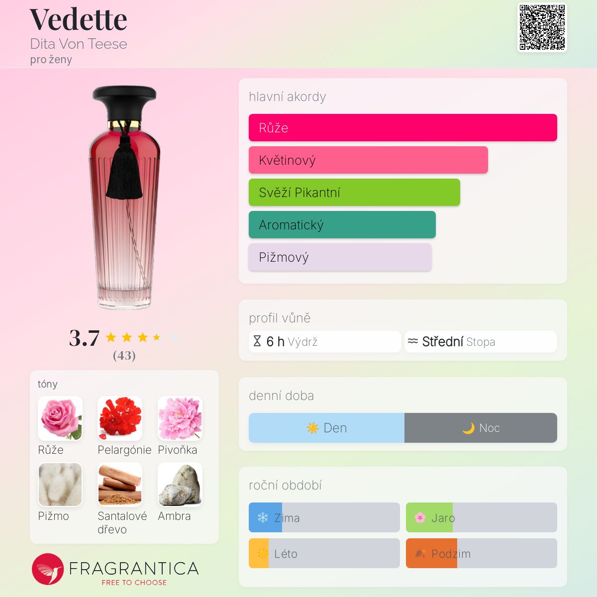 Vedette podle Dita Von Teese je Orientální Floral vůně pro ženy. Toto je nová vůně. Vedette byl/a uveden/a v roce 2023. Vrchní tóny jsou Růže, Pelargónie a Nové koření; střední tóny jsouTurecká růže, Pivoňka a Vřes ; základní tóny jsou Pižmo, Santalové dřevo a Ambra.