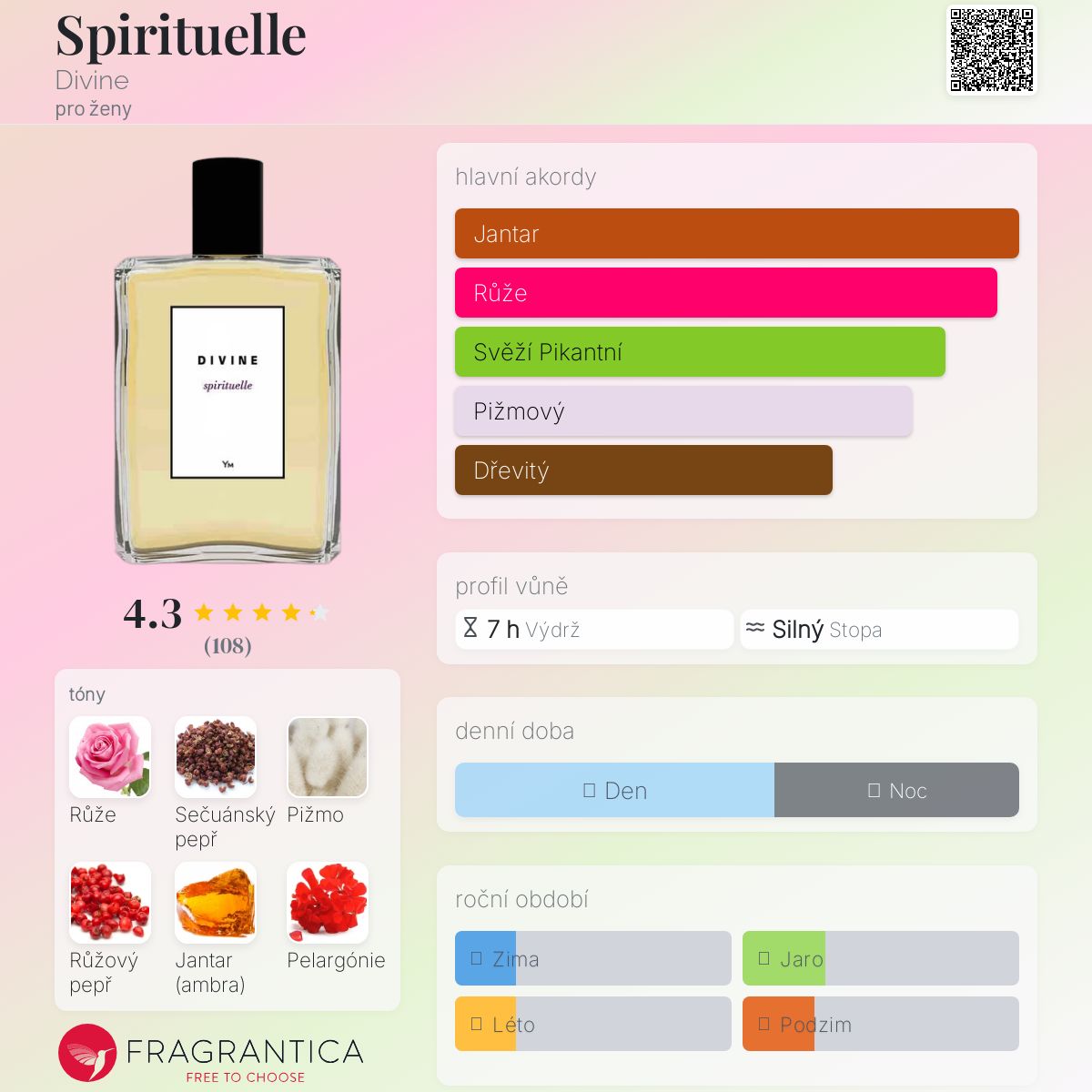Spirituelle podle Divine je Floral vůně pro ženy. Spirituelle byl/a uveden/a v roce 2014. "Nosem" za touto vůní je Richard Ibanez. Vrchní tóny jsou Sečuánský pepř, Růžový pepř, Pelargónie a Labdanum; střední tón jeRůže ; základní tóny jsou Pižmo, Jantar (ambra), Cedr a Kadidlo.