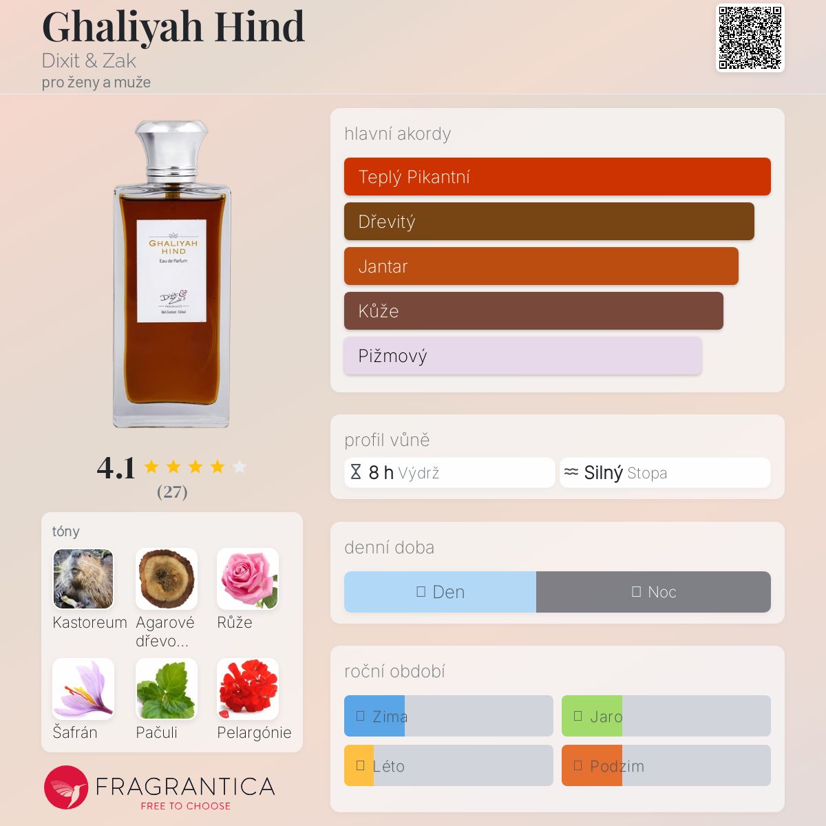 Ghaliyah Hind podle Dixit & Zak je vůně pro ženy a muže. Ghaliyah Hind byl/a uveden/a v roce 2021. Ghaliyah Hind byl/a vytvořen/a Nitish Dixit a Zakir Laskar. Vrchní tóny jsou Damašská růže a Bergamot; střední tóny jsouRůže, Pelargónie, Kardamom, Jasmín a Tuberóza ; základní tóny jsou Kastoreum, Agarové dřevo (oud), Šafrán, Pačuli, Vanilka, Santalové dřevo, Olibanum, Cibetka, Jantar (ambra), Labdanum, Daman, Ambra a Choya Nakh.