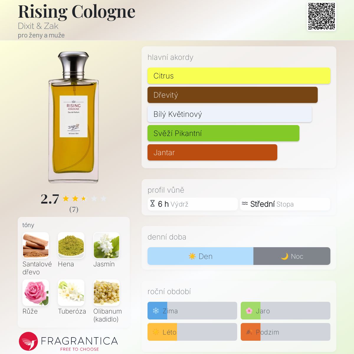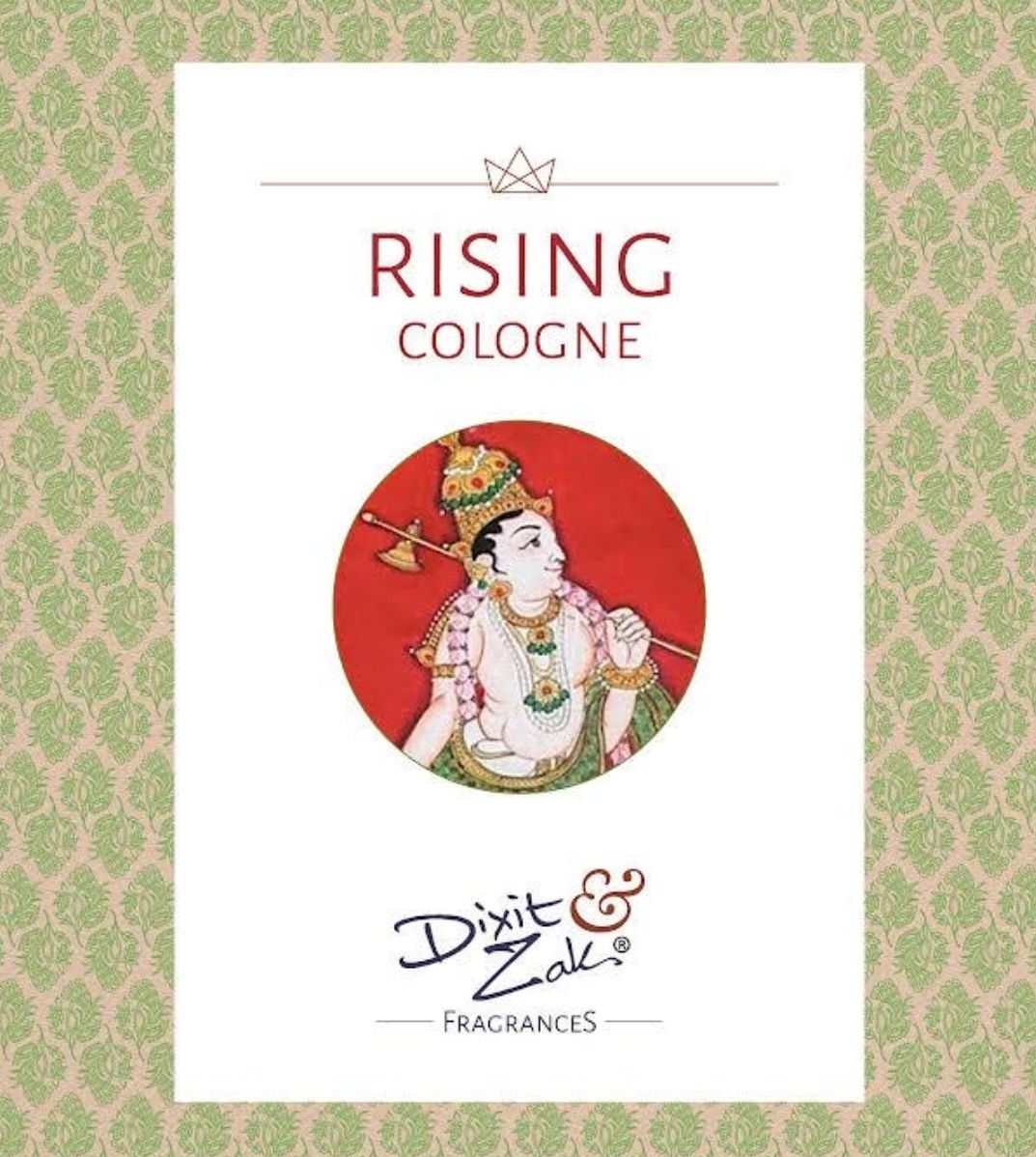 Rising Cologne podle Dixit & Zak je Citrus vůně pro ženy a muže. Rising Cologne byl/a uveden/a v roce 2022. Rising Cologne byl/a vytvořen/a Nitish Dixit a Zakir Laskar. Vrchní tóny jsou Jasmín, Růže, Sladký pomeranč, Mandarinka, Limetka a Bergamot; střední tóny jsouHena, Jasmín, Tuberóza, Zázvor, Růžový pepř a Ylang-Ylang ; základní tóny jsou Australské santalové dřevo, Santalové dřevo, Olibanum, Agarové dřevo (oud), Jíl a Cibetka.
