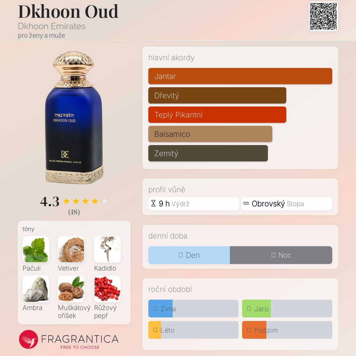 Dkhoon Oud podle Dkhoon Emirates je Orientální Woody vůně pro ženy a muže. Toto je nová vůně. Dkhoon Oud byl/a uveden/a v roce 2022. "Nosem" za touto vůní je Nathalie Templer. Vrchní tóny jsou Muškátový oříšek, Růžový pepř a Hřebíček; střední tóny jsouList pačuli a Jantar (ambra) ; základní tóny jsou Vetiver, Kadidlo, Ambra a Agarové dřevo (oud).