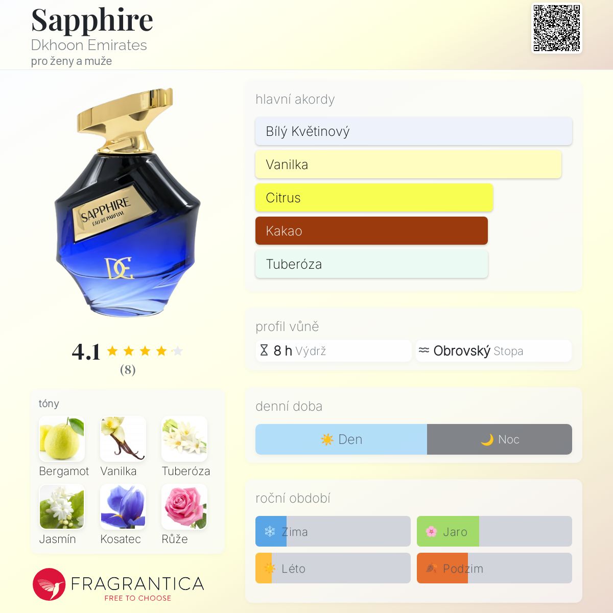 Sapphire podle Dkhoon Emirates je Orientální Floral vůně pro ženy a muže. Sapphire byl/a uveden/a v roce 2021. Vrchní tóny jsou Bergamot a Vanilka; střední tóny jsouTuberóza, Jasmín, Kosatec a Bulharská růže ; základní tóny jsou Fazole tonka, Kakao a Vanilka.