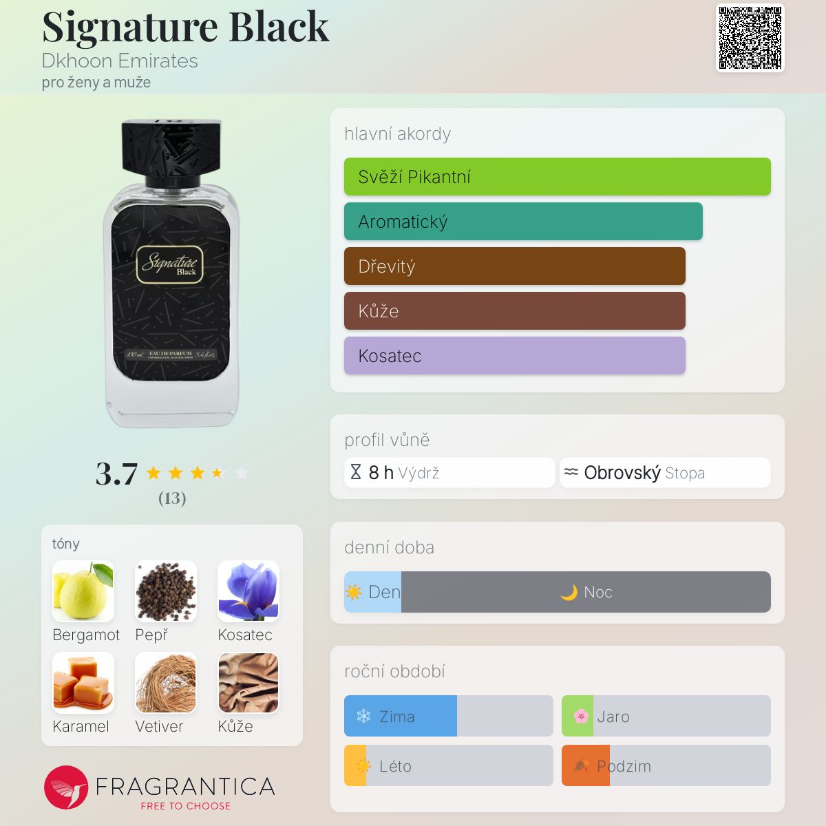 Signature Black podle Dkhoon Emirates je Leather vůně pro ženy a muže. Signature Black byl/a uveden/a v roce 2022. "Nosem" za touto vůní je Jordi Fernández. Vrchní tóny jsou Bergamot a Pepř; střední tóny jsouKosatec a Karamel ; základní tóny jsou Vetiver a Kůže.