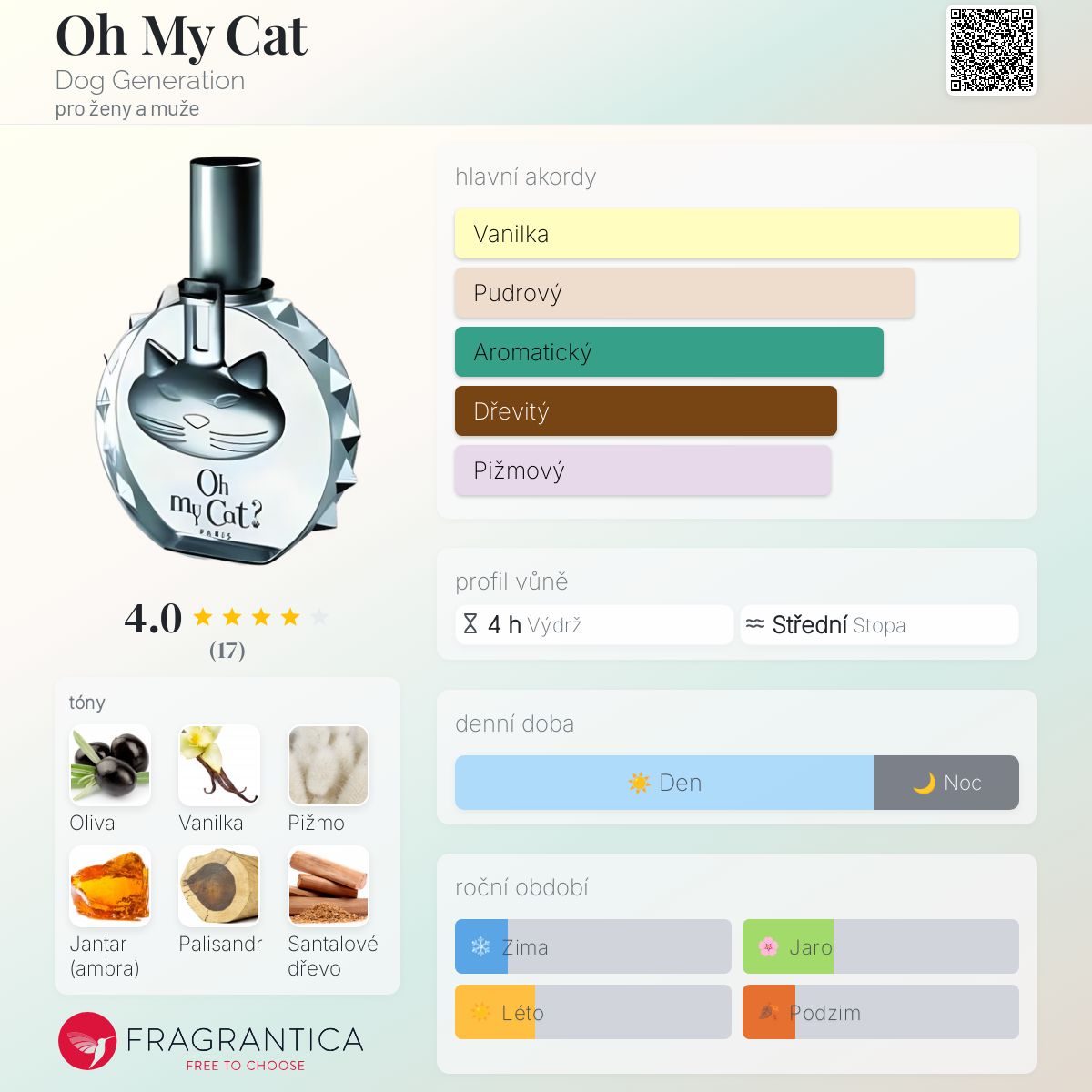 Oh My Cat podle Dog Generation je Floral Woody Musk vůně pro ženy a muže. Oh My Cat byl/a uveden/a v roce 2001. Oh My Cat byl/a vytvořen/a Bernard Ellena a Maurice Roucel. Vrchní tóny jsou Palisandr, Mandarinka a Bergamot; střední tóny jsouOliva, Santalové dřevo, Jasmín, Frézie, Magnólie a Cedr ; základní tóny jsou Vanilka, Pižmo a Jantar (ambra).