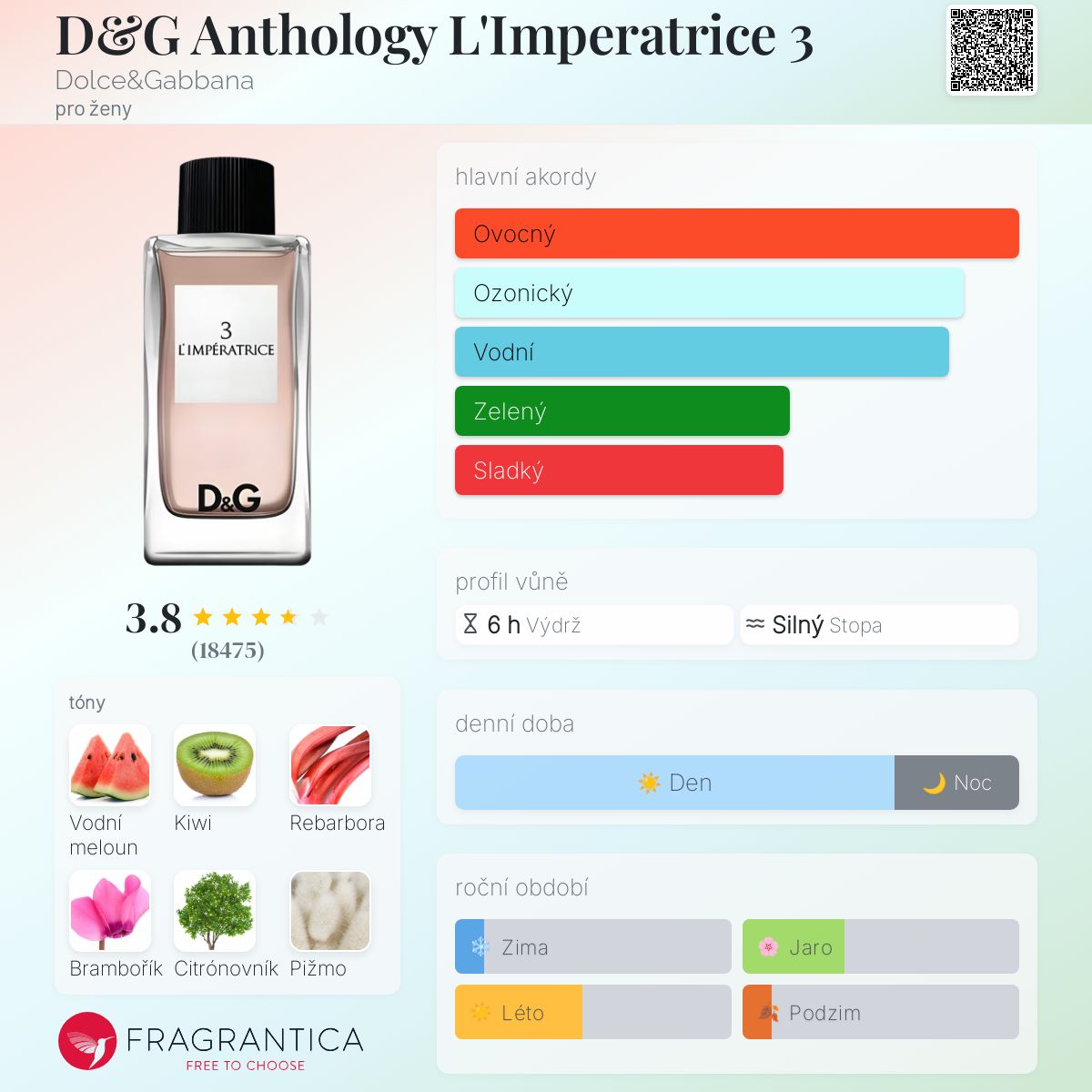 D&G Anthology L'Imperatrice 3 podle Dolce&Gabbana je Floral Aquatic vůně pro ženy. D&G Anthology L'Imperatrice 3 byl/a uveden/a v roce 2009. Vrchní tóny jsou Kiwi, Rebarbora a Růžový pepř; střední tóny jsouVodní meloun, Brambořík a Jasmín ; základní tóny jsou Citrónovník, Pižmo a Santalové dřevo.