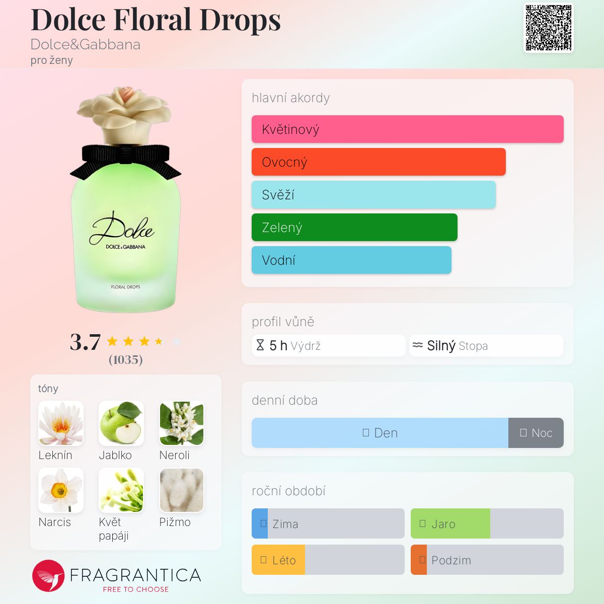 Dolce Floral Drops podle Dolce&Gabbana je Floral vůně pro ženy. Dolce Floral Drops byl/a uveden/a v roce 2015. Dolce Floral Drops byl/a vytvořen/a Jean-Marc Chaillan a Laurent Le Guernec. Vrchní tóny jsou Jablko, Neroli, Květ papáji a Broskev; střední tóny jsouLeknín, Narcis a Amarylka ; základní tóny jsou Pižmo, Kašmírové dřevo a Santalové dřevo.
