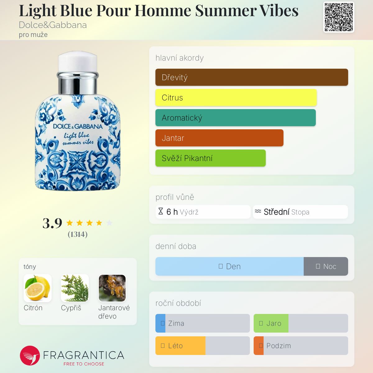 Light Blue Pour Homme Summer Vibes podle Dolce&Gabbana je Woody Aromatic vůně pro muže. Toto je nová vůně. Light Blue Pour Homme Summer Vibes byl/a uveden/a v roce 2023. "Nosem" za touto vůní je Alberto Morillas. Vrchní tón je Sicilský citron ; střední tón jeCypřiš ; základní tón je Jantarové dřevo.