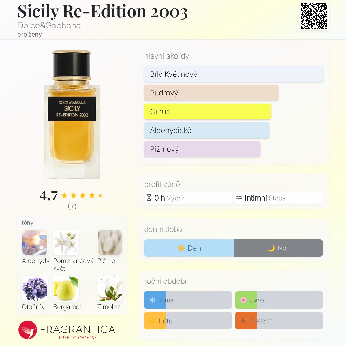 Sicily Re-Edition 2003 podle Dolce&Gabbana je Floral Aldehyde vůně pro ženy. Toto je nová vůně. Sicily Re-Edition 2003 byl/a uveden/a v roce 2025. "Nosem" za touto vůní je Nathalie Lorson. Vrchní tóny jsou Aldehydy, Pomerančový květ a Kalábrijský bergamot; střední tóny jsouZimolez, Jasmín a Hyacint ; základní tóny jsou Bílé pižmo, Otočník a Santalové dřevo.