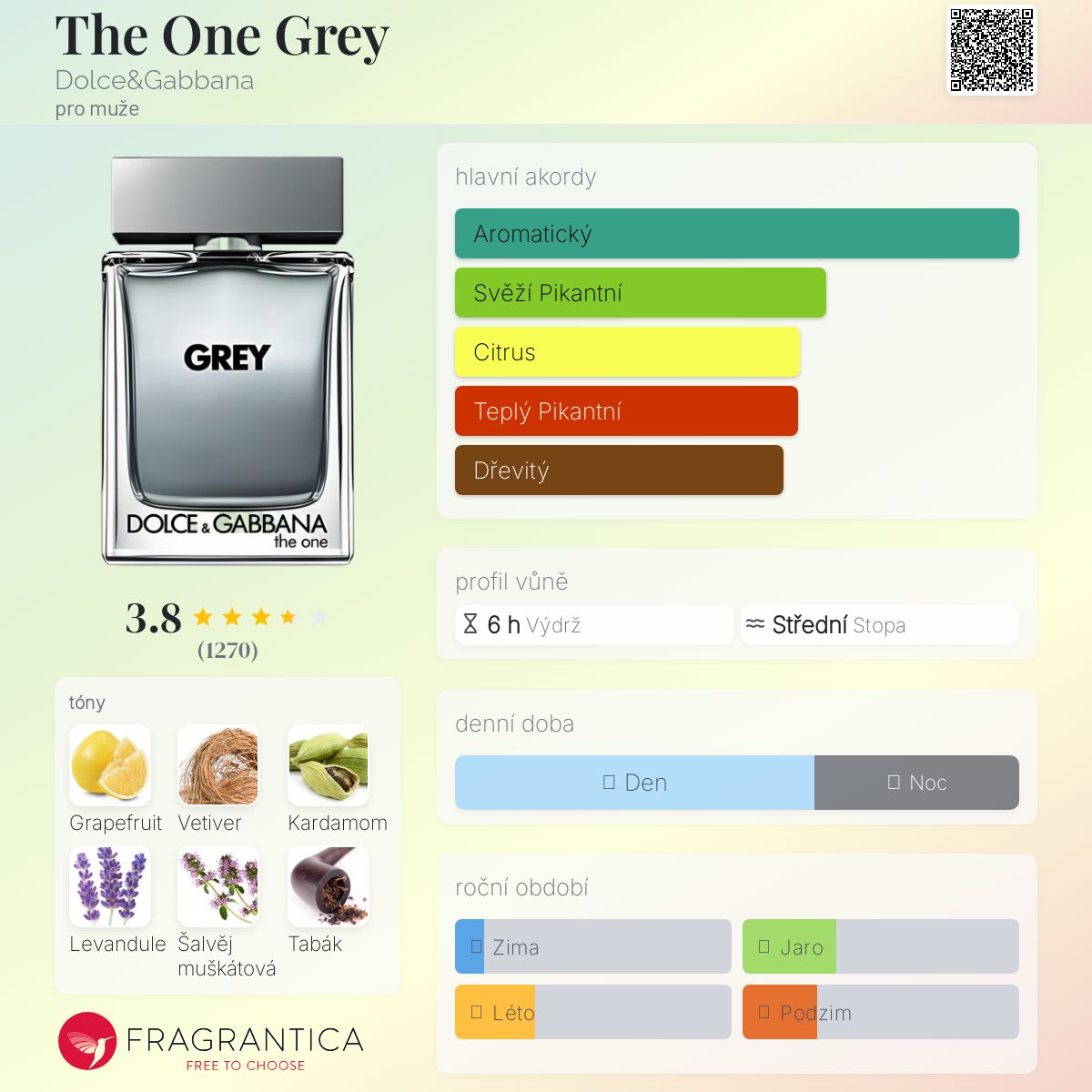 The One Grey podle Dolce&Gabbana je Woody Aromatic vůně pro muže. The One Grey byl/a uveden/a v roce 2018. "Nosem" za touto vůní je Jean-Jean-Christophe Hérault. Vrchní tóny jsou Grapefruit, Kardamom, Koriandr a Bazalka; střední tóny jsouLevandule, Šalvěj muškátová a Pelargónie ; základní tóny jsou Vetiver, Tabák, Pačuli a Labdanum.