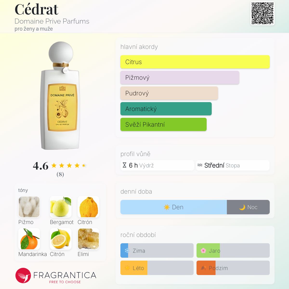 Cédrat podle Domaine Prive Parfums je Citrus vůně pro ženy a muže. Cédrat byl/a uveden/a v roce 2019. Vrchní tóny jsou Bergamot, Mandarinka a Citrón; střední tóny jsouCitrón, Elimi, Kardamom a Cedr ; základní tóny jsou Bílé pižmo a Jantar (ambra).