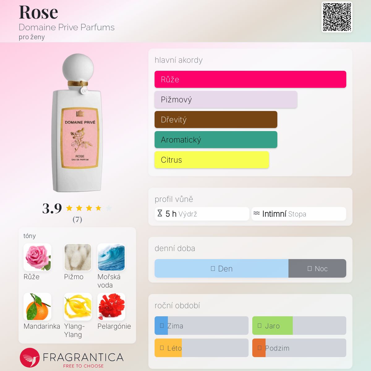 Rose podle Domaine Prive Parfums je Floral vůně pro ženy. Rose byl/a uveden/a v roce 2019. Vrchní tóny jsou Růže, Mořské tóny a Mandarinka; střední tóny jsouKvětná růže, Ylang-Ylang, Pelargónie a Lilie ; základní tóny jsou Bílé pižmo, Dřevité tóny a Jantar (ambra).