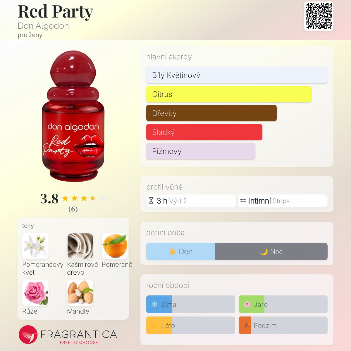 Red Party podle Don Algodon je Floral Fruity vůně pro ženy. Toto je nová vůně. Red Party byl/a uveden/a v roce 2024. Vrchní tóny jsou Pomeranč a Sladký pomeranč; střední tóny jsouPomerančový květ a Travní růže ; základní tóny jsou Kašmírové dřevo a Mandle.
