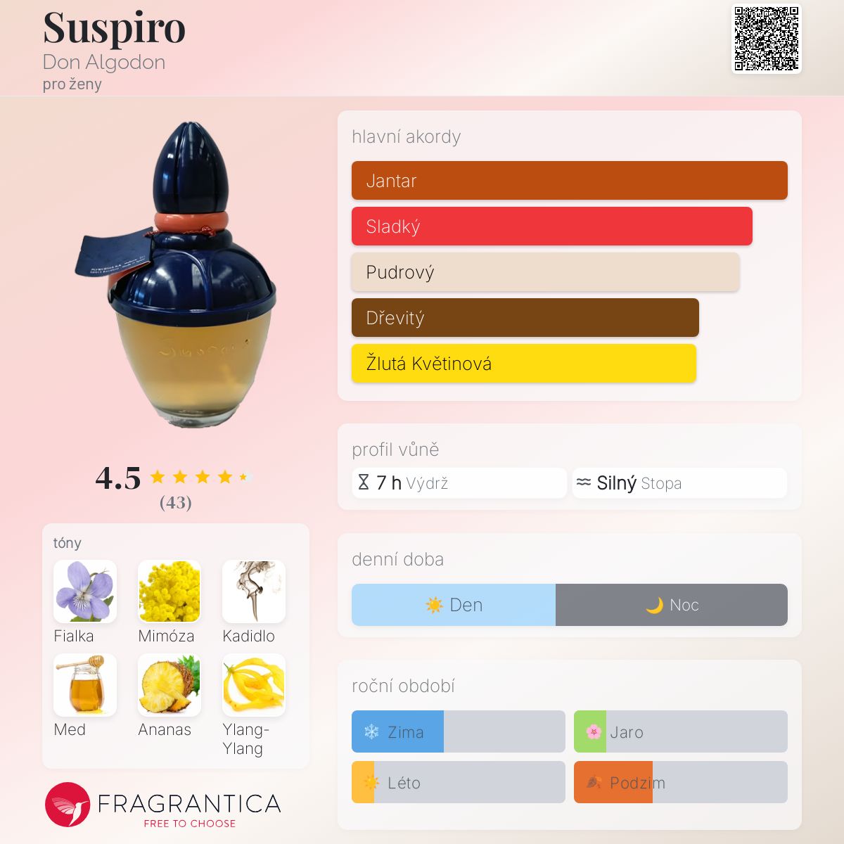 Suspiro podle Don Algodon je Orientální Floral vůně pro ženy. Suspiro byl/a uveden/a v roce 1991. "Nosem" za touto vůní je Ramon Monegal. Vrchní tóny jsou Fialka, Ananas, Aldehydy, Pomeranč, Červené jablko a Lilie; střední tóny jsouMimóza, Ylang-Ylang a Jasmín ; základní tóny jsou Kadidlo, Bílý med, Santalové dřevo, Benzoin, Jantar (ambra), Vanilka, Francouzské labdanum a Virginský cedr.