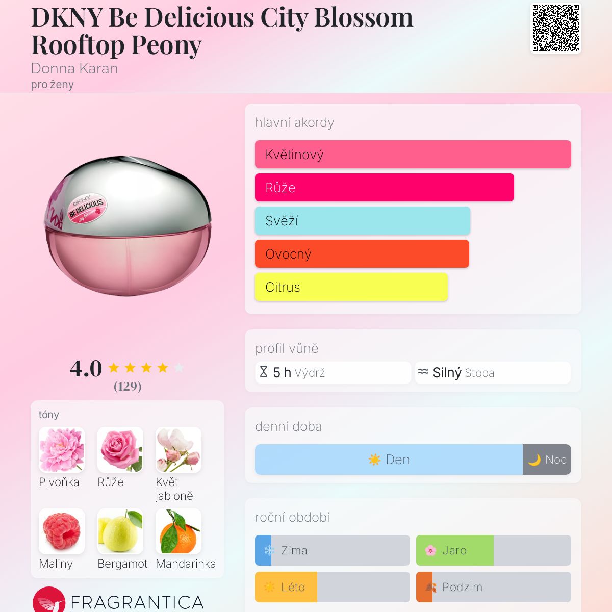 DKNY Be Delicious City Blossom Rooftop Peony podle Donna Karan je Floral Fruity vůně pro ženy. DKNY Be Delicious City Blossom Rooftop Peony byl/a uveden/a v roce 2014. Vrchní tóny jsou Květ jabloně , Bergamot, Mandarinka a Černý rybíz; střední tóny jsouPivoňka, Růže a Maliny ; základní tóny jsou Jantar (ambra), Mignonette a Santalové dřevo.