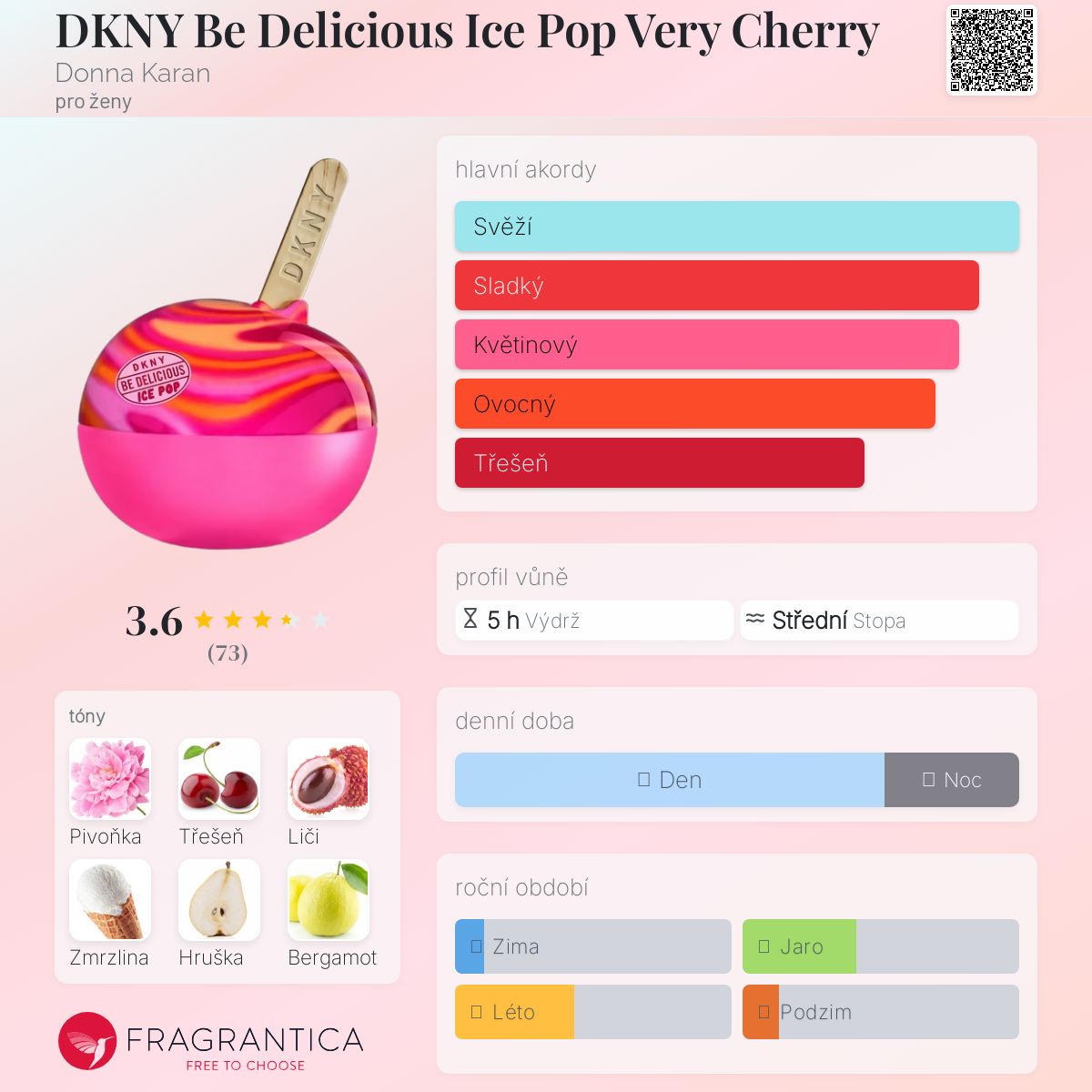 DKNY Be Delicious Ice Pop Very Cherry podle Donna Karan je Floral Fruity Gourmand vůně pro ženy. Toto je nová vůně. DKNY Be Delicious Ice Pop Very Cherry byl/a uveden/a v roce 2025. Vrchní tóny jsou Třešeň, Liči, Zmrzlina a Bergamot; střední tóny jsouPivoňka, Hruška a Červený mák ; základní tóny jsou Pižmo, Jantar (ambra) a Santalové dřevo.