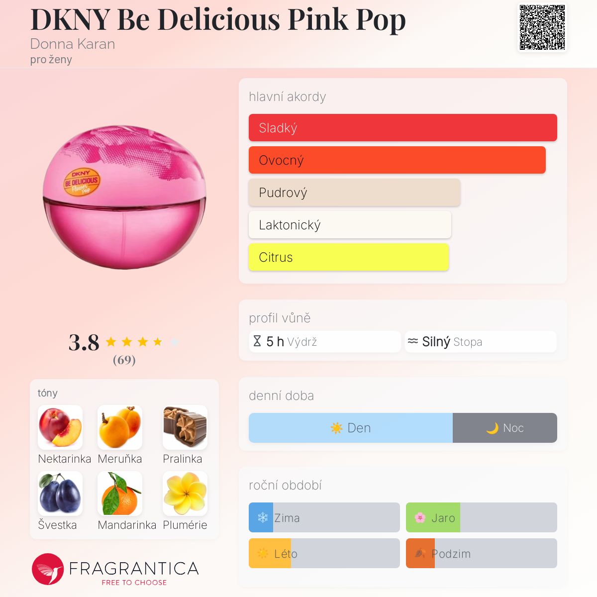 DKNY Be Delicious Pink Pop podle Donna Karan je Floral Fruity Gourmand vůně pro ženy. DKNY Be Delicious Pink Pop byl/a uveden/a v roce 2018. Vrchní tóny jsou Nektarinka, Švestka a Mandarinka; střední tóny jsouMeruňka, Plumérie a Jasmín Sambac ; základní tóny jsou Pralinka, Santalové dřevo, Pižmo a Jantar (ambra).
