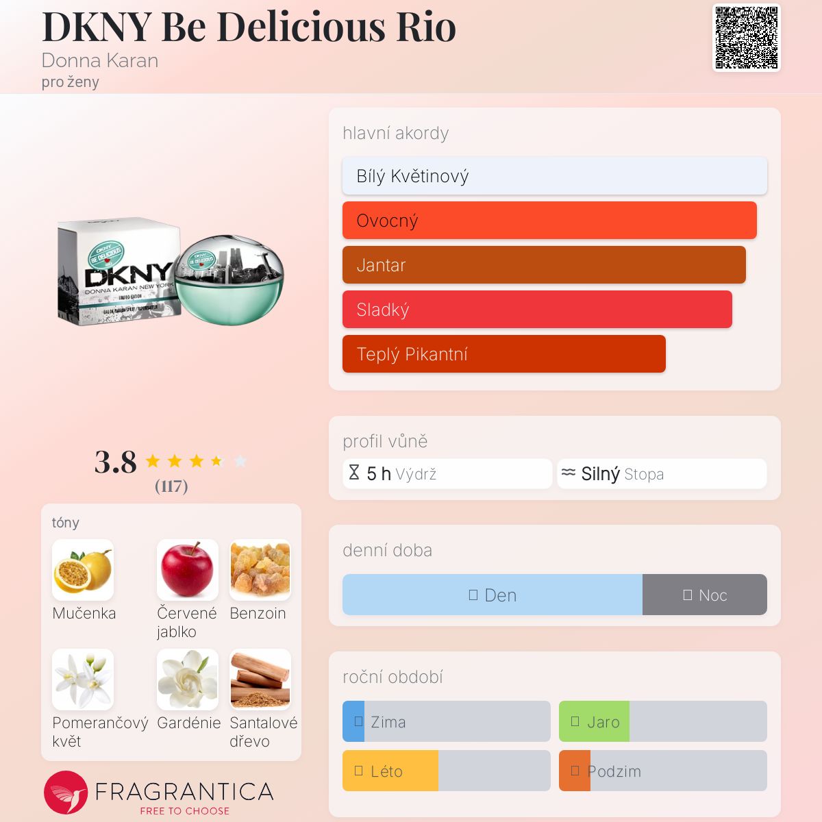 DKNY Be Delicious Rio podle Donna Karan je Floral Fruity vůně pro ženy. DKNY Be Delicious Rio byl/a uveden/a v roce 2012. Vrchní tóny jsou Mučenka a Červené jablko; střední tóny jsouPomerančový květ a Gardénie ; základní tóny jsou Benzoin, Santalové dřevo a Myrha.