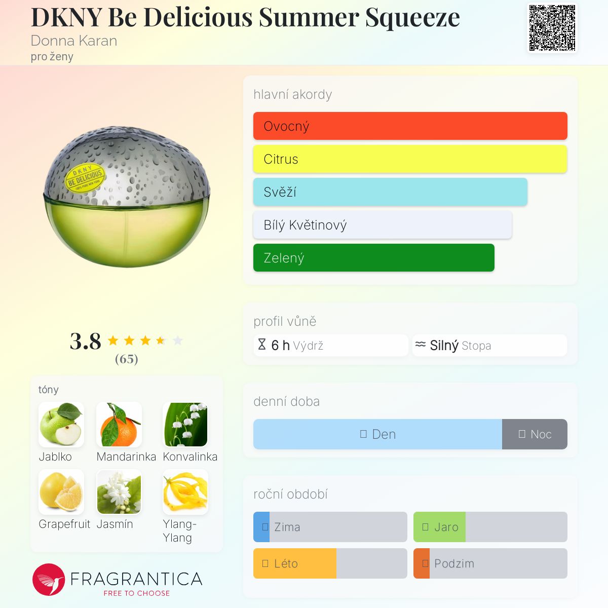 DKNY Be Delicious Summer Squeeze podle Donna Karan je Floral Fruity vůně pro ženy. DKNY Be Delicious Summer Squeeze byl/a uveden/a v roce 2020. Vrchní tóny jsou Mandarinka, Grapefruit, Pomeranč, Černý rybíz a Zázvor; střední tóny jsouZelené jablko, Konvalinka, Jasmín Sambac a Ylang-Ylang ; základní tóny jsou Bílé dřevo, Vanilka a Pižmo.
