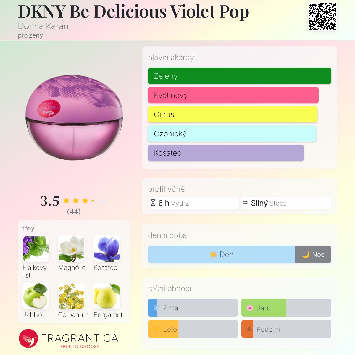 DKNY Be Delicious Violet Pop podle Donna Karan je Floral Woody Musk vůně pro ženy. DKNY Be Delicious Violet Pop byl/a uveden/a v roce 2018. Vrchní tóny jsou Jablko, Galbanum a Bergamot; střední tóny jsouFialkový list, Magnólie a Pomerančový květ ; základní tóny jsou Kosatec, Pačuli a Styrax.