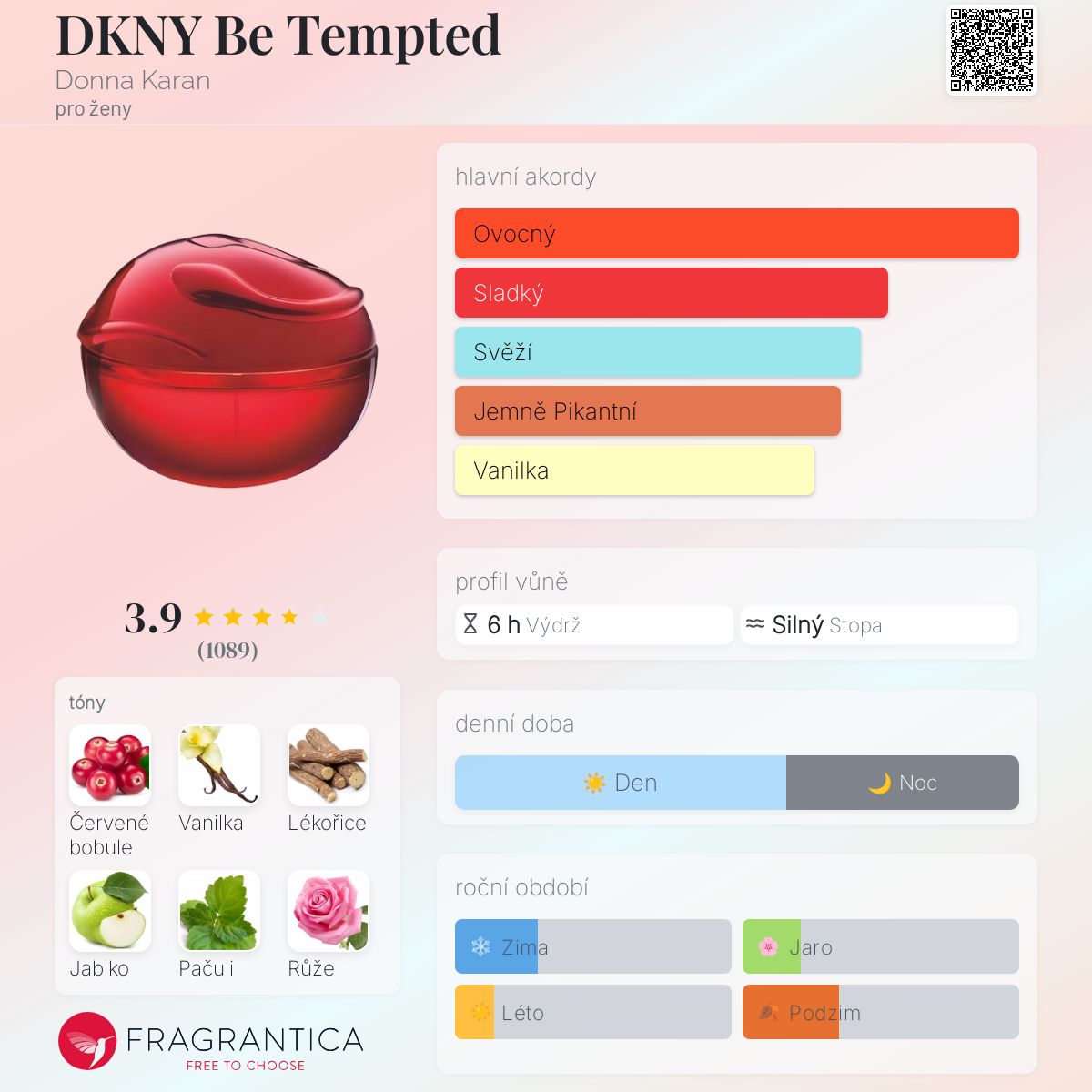 DKNY Be Tempted podle Donna Karan je Floral Fruity Gourmand vůně pro ženy. DKNY Be Tempted byl/a uveden/a v roce 2016. Vrchní tóny jsou Červené bobule, Lékořice, Jablko, Kasie a Citrón; střední tóny jsouRůže, Fialka a Pomerančový květ ; základní tóny jsou Vanilka, List indonéského pačuli a Myrha.
