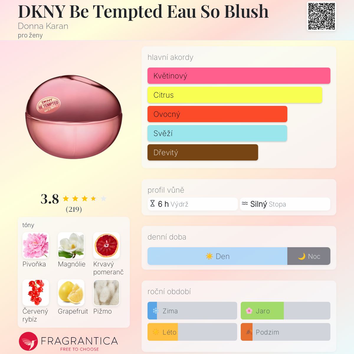 DKNY Be Tempted Eau So Blush podle Donna Karan je Floral Fruity vůně pro ženy. DKNY Be Tempted Eau So Blush byl/a uveden/a v roce 2016. Vrchní tóny jsou Magnólie, Krvavý pomeranč, Červený rybíz a Růžový grapefruit; střední tóny jsouPivoňka, Jasmín a Cedr ; základní tóny jsou Pižmo, Meruňka a Dřevité tóny.