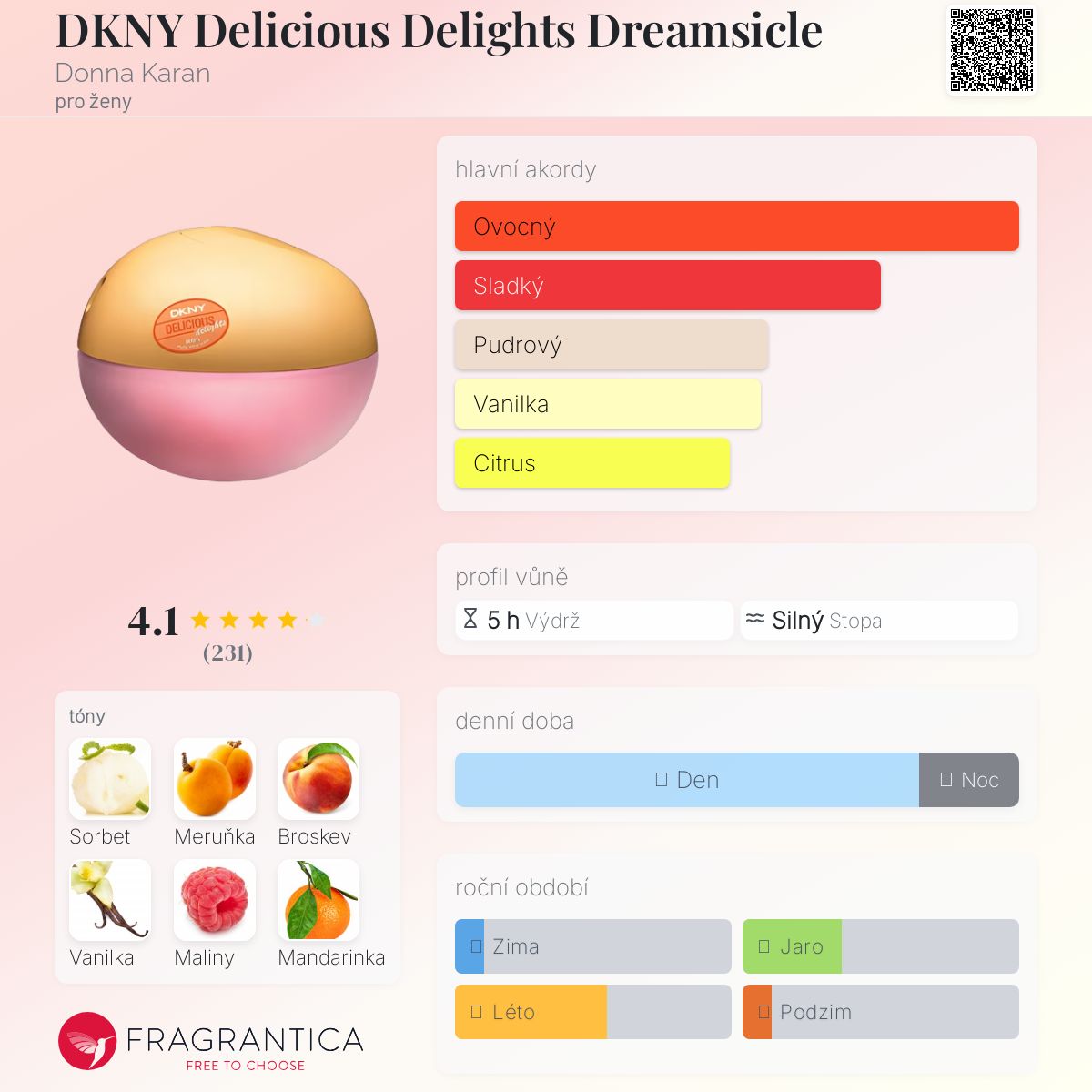 DKNY Delicious Delights Dreamsicle podle Donna Karan je Floral Fruity vůně pro ženy. DKNY Delicious Delights Dreamsicle byl/a uveden/a v roce 2015. Vrchní tóny jsou Maliny, Mandarinka a Borůvky; střední tóny jsouSorbet, Meruňka, Broskev a Zelené jablko ; základní tóny jsou Vanilka, Santalové dřevo a Cedr.